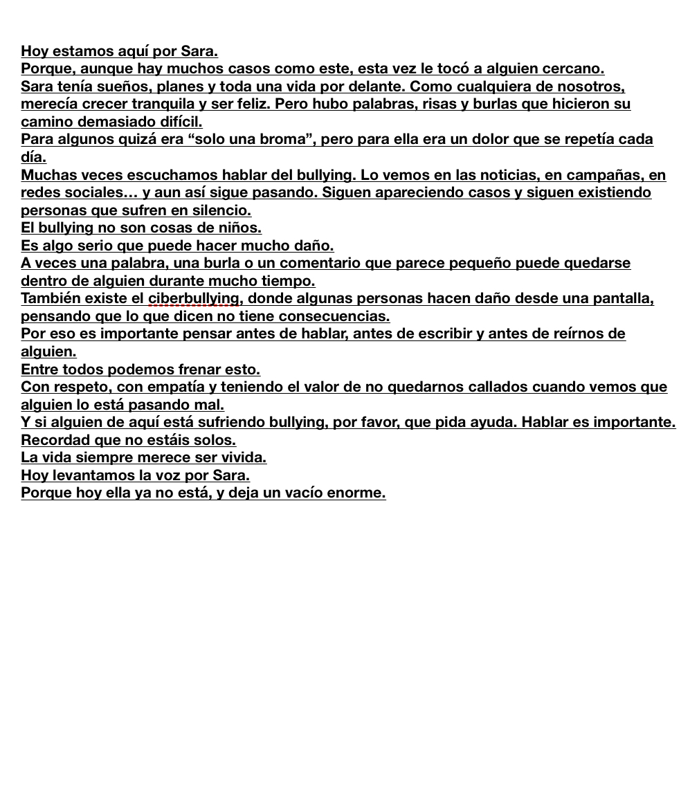 A las 10:30 de la mañana, el alumnado de 1º del Ciclo Formativo de Atención a Personas en Situación de Dependencia realizó una lectura en recuerdo de Sara en el hall del centro, acompañado por estudiantes, personal y profesorado del centro. Durante el acto, su amiga y compañera, Jennifer García, le dedicó una poesía escrita por ella misma. Posteriormente, se encendieron velas que el alumnado fue depositando en una mesa preparada para honrar su memoria, junto a mensajes, flores, dedicatorias y fotografías. El homenaje concluyó con un minuto de silencio que finalizó con un emotivo aplauso.